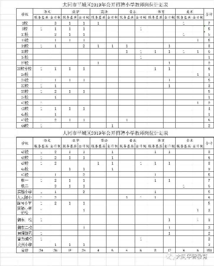 為進一步優化我區教師隊伍結構,不斷充實教師力量,根據國家、省、市事業單位公開招聘工作人員有關規定,經區委、區政府研究決定:面向社會公開招聘小學教師150名。經區招聘領導組研究制定,并報大同市人力資源和社會保障局對招聘實施方案批復,現將大同市平城區2019年公開招聘小學教師相關事宜公告如下: