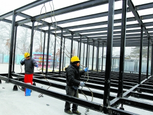 昨天,工人們在清華大學內(nèi)搭建“零耗能”住宅。從現(xiàn)在起至4月份,20名教授和50名學生將在清華游泳館東側(cè)的空地上搭建一所“零耗能”住宅,這是清華大學參加國際太陽能十項全能競賽的作品。目前,房子的整體鋼結(jié)構(gòu)已經(jīng)搭建完畢。本報記者吳鏑攝