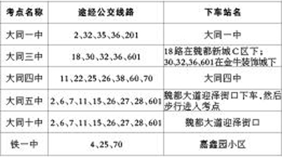 據(jù)市公交公司運調(diào)處負責(zé)人介紹,市區(qū)范圍內(nèi)參加“愛心送考”的公交車共有382臺,線路涉及21條。其中,大同一中、大同四中兩個考點的下車站名就是學(xué)校本名。大同三中考點的下車站名根據(jù)所乘線路不同有兩個。乘坐18路的考生和家長,在魏都新城C區(qū)下車;乘坐30路、32路、36路、601路的考生和家長,在金牛裝飾城下車,步行一段進入考點。大同五中考點因局部道路封閉,只能在魏都大道迎澤街口下車,然后步行進入。大同十中考點的下車站名為魏都大道迎澤街口。鐵一中考點的下車站名為嘉鑫園小區(qū)。