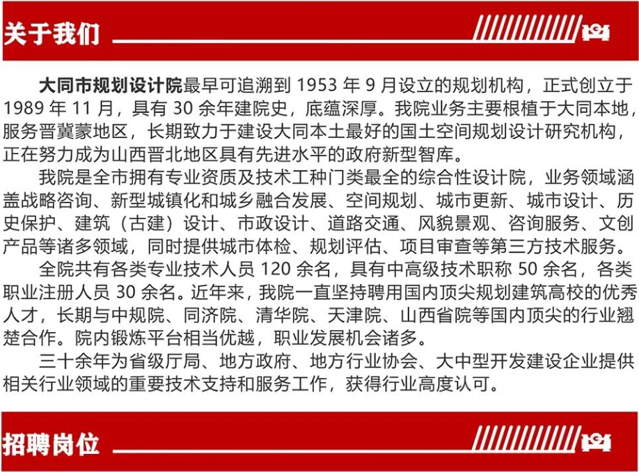 大同市規劃設計院,成立于1989 年11 月。是大同市城鄉規劃局下屬的全民事業單位,是以城市規劃為主體的具有城市規劃甲級資質,市政公用行業乙級資質,建筑工程設計乙級資質、工程咨詢丙級資質的綜合性設計院。
