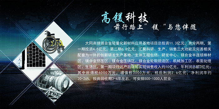 大同高鎂科技有限公司是擁有30幾年鎂合金研發、生產、應用經驗,是國內首批的鎂合金生產廠家,為國家科技部掛牌的鎂及鎂合金產業基地、是北京市高新技術企業和中關村高新技術企業,股東包括中關村發展集團,總資產16億元。公司堅持走產學研相結合的道路,依托清華大學、北京科技大學、北京有色金屬研究總院等科研院校,產品形成鎂合金鑄造、壓鑄、擠壓、沖壓、軋制五大板塊200多個品種,同時還配套了鎂合金半連鑄棒材生產、CNC精密加工、表面處理、焊接、檢測檢驗等綜合服務體系。